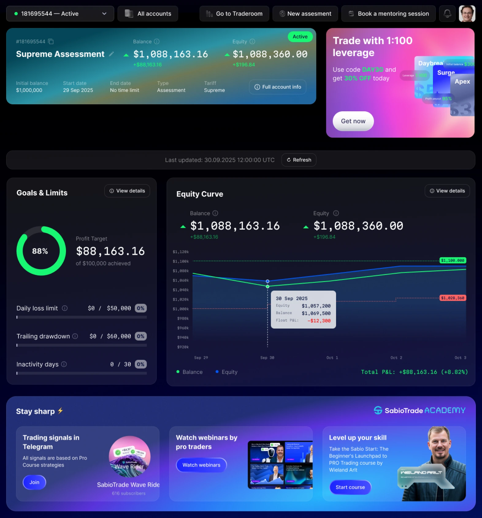Sabio Trade combines features that make it a fit for all kinds of traders: simple 1-step assessment and free education for beginners, mentorship for developing traders, and extra-large funding for pros.
