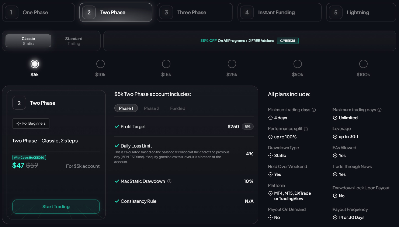 Funding is capped at $200K, and scaling opportunities are limited. However, many traders may find the flexible conditions and the low entry cost — starting at just $35, one of the lowest on our list — especially appealing.