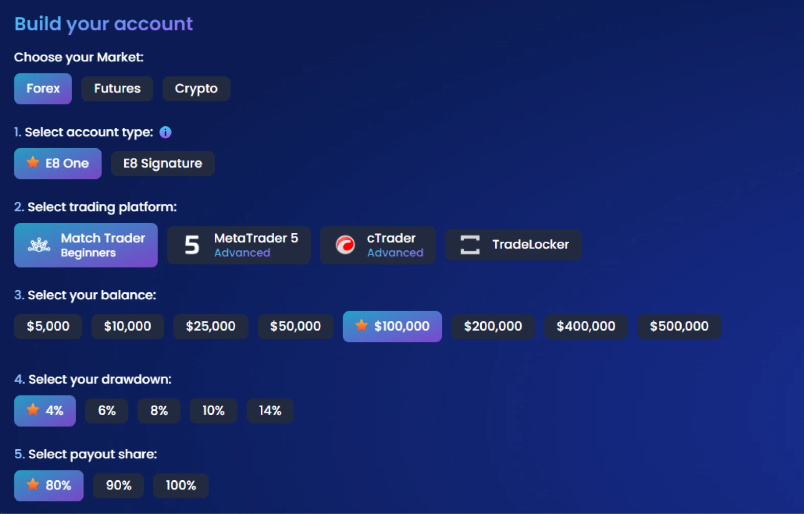 E8 has several interesting features that make it stand out. For example, you can customize your assessment flow by choosing your market (Forex, Futures, or Crypto), assessment type (1-2-3 step), drawdown % and profit split % — something that we haven’t seen anywhere else.
