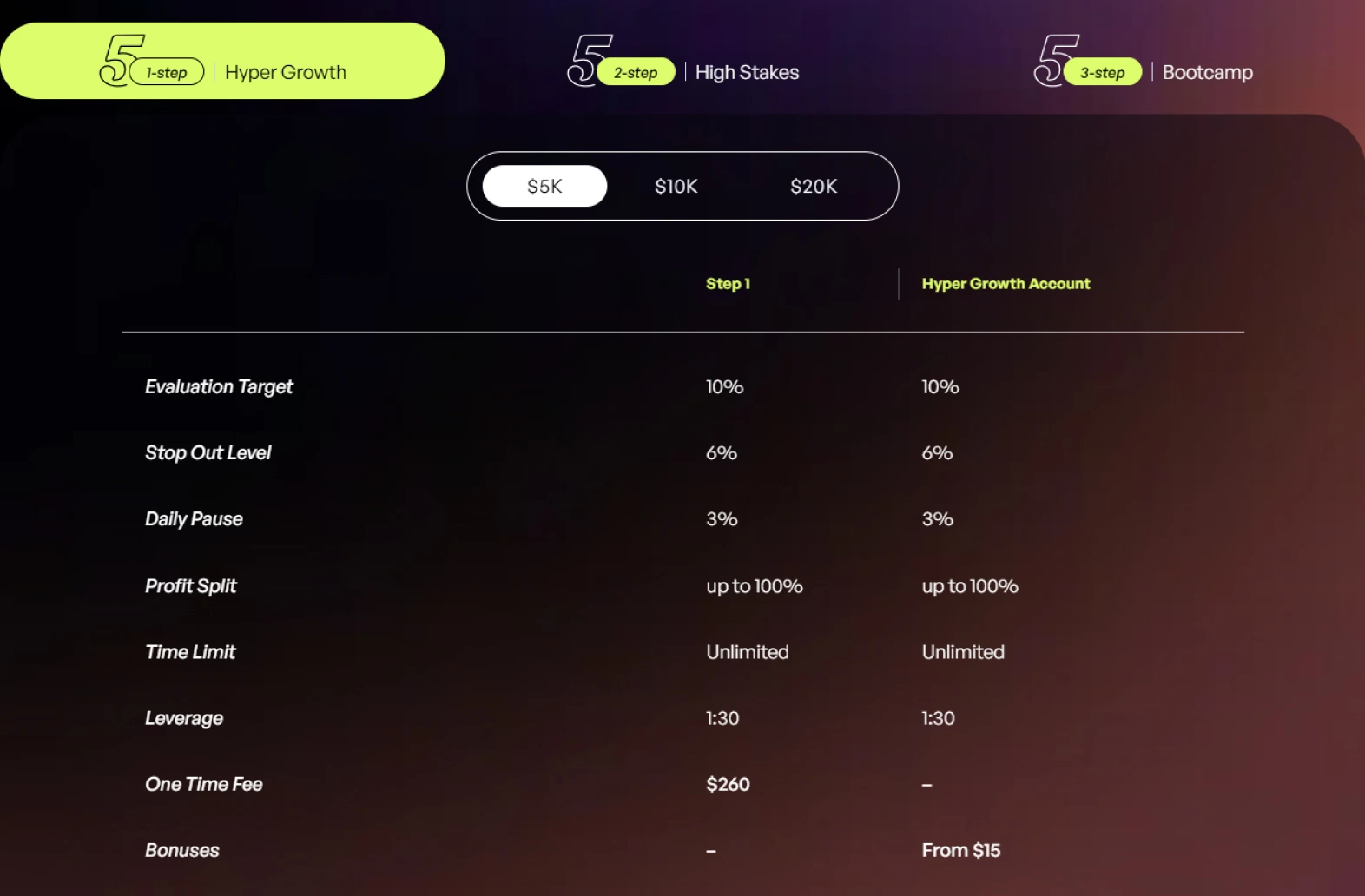The 5%ers is known for its low-risk funding model and structured growth plans. Unlike many competitors, The 5%ers offers three different evaluation types — Hyper Growth, High Stakes, and Bootcamp — each with unique conditions and scaling paths.