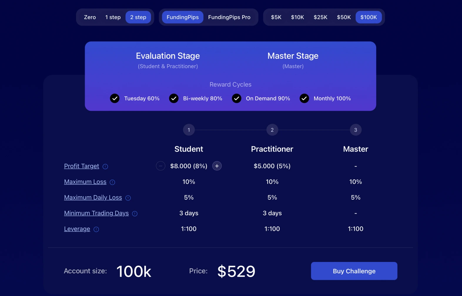 Funding Pips focuses on Forex and CFD trading and is known for its Zero Payout Denial commitment and straightforward rules. While its structure is similar to many major prop firms, Funding Pips includes several standout features.