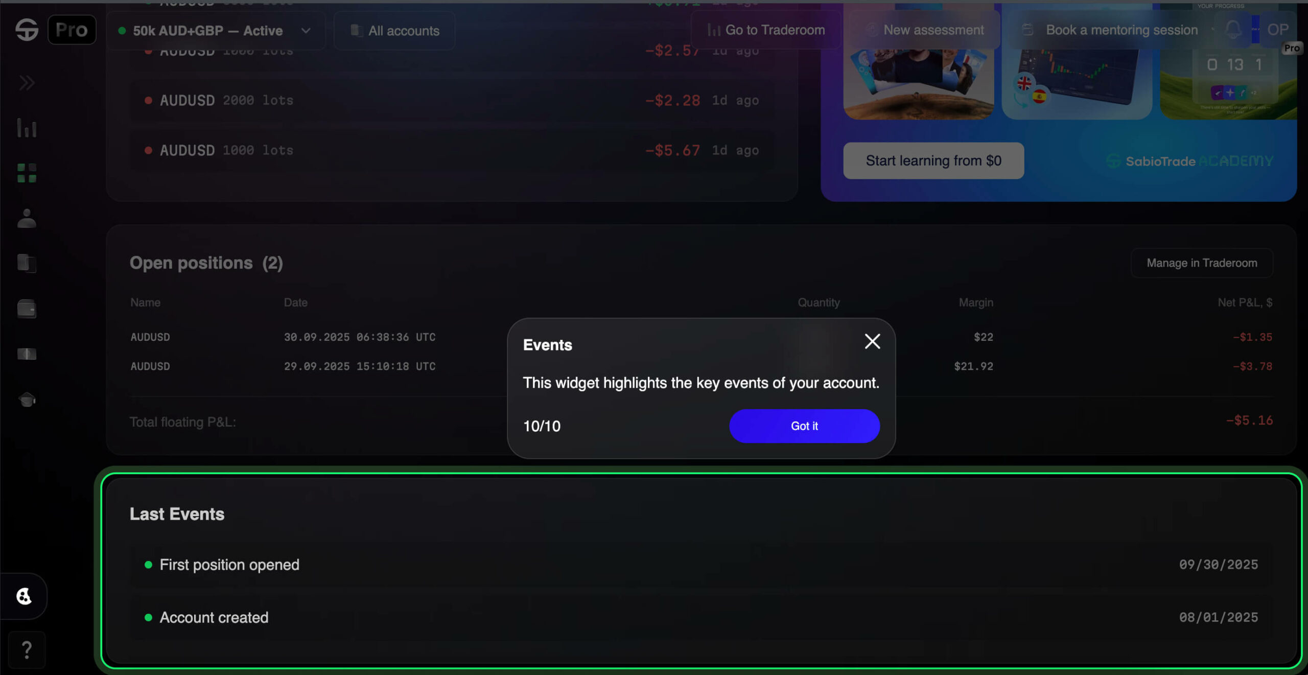 The Last Events widget works like a personal timeline of your account, recording key milestones such as when your account was created, your very first trade, and every important step after that.