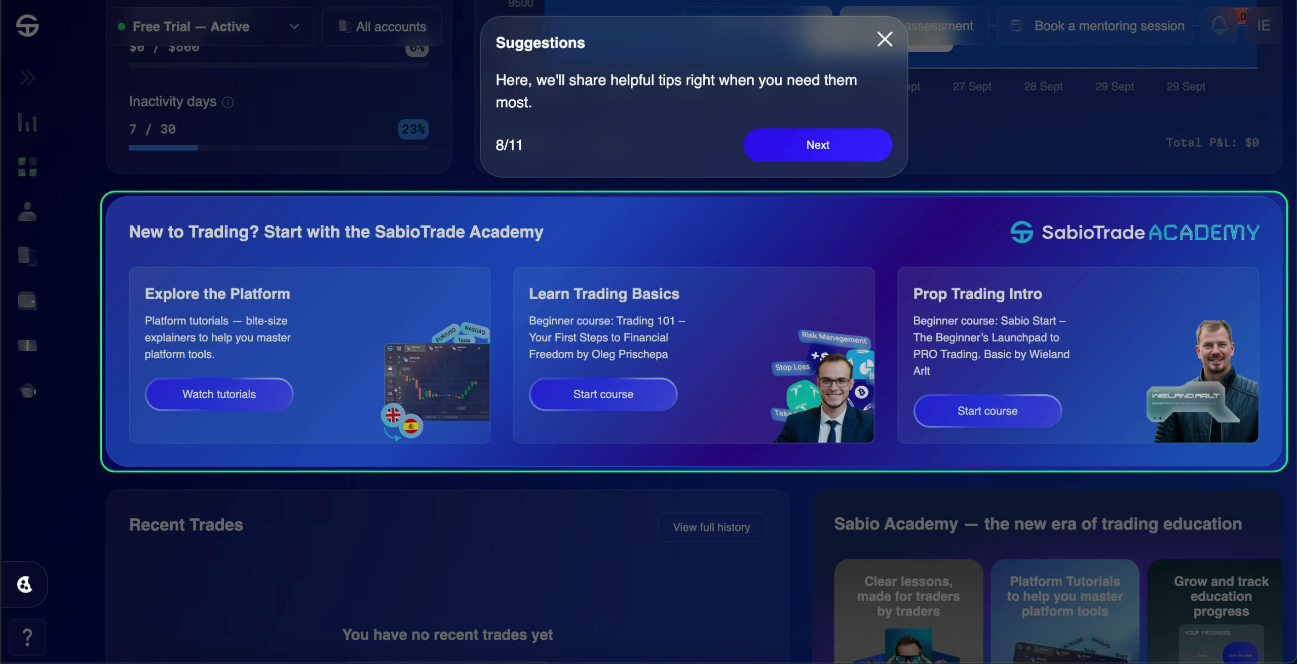 In case you didn’t know, we have a Sabio Academy where we teach traders everything from the basics to advanced strategies. The Suggestions Widget pulls that right into your dashboard.