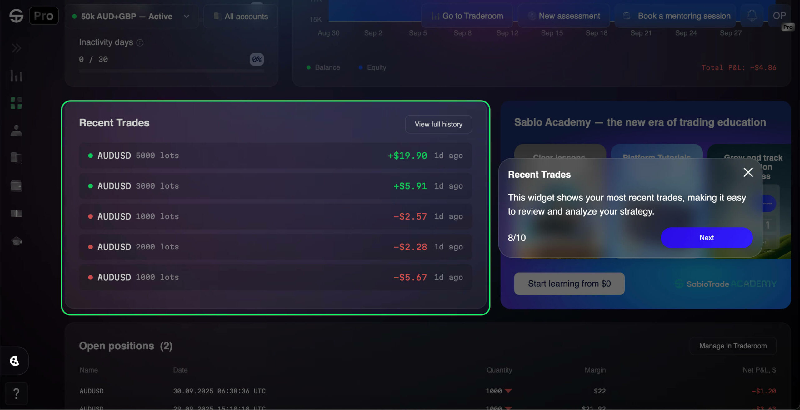 Want to dig deeper? A direct link to your full Traderoom history is just one click away, so you can review, analyze, and learn from your recent activity without losing time.