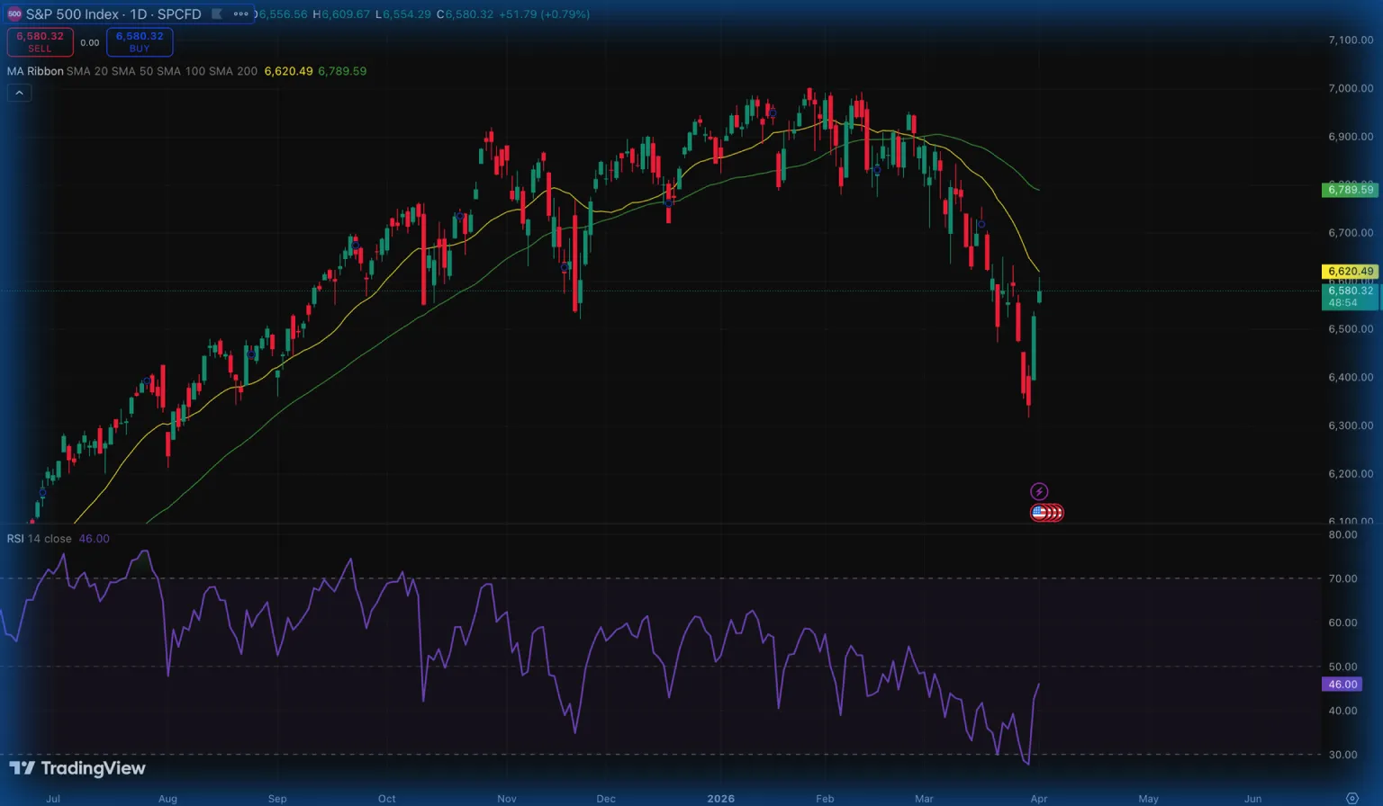 The S&P 500 (main benchmark) is currently testing the 20-day moving average at the yellow line. The RSI is moving towards 50 after bouncing back from 25 due to a bearish leg.