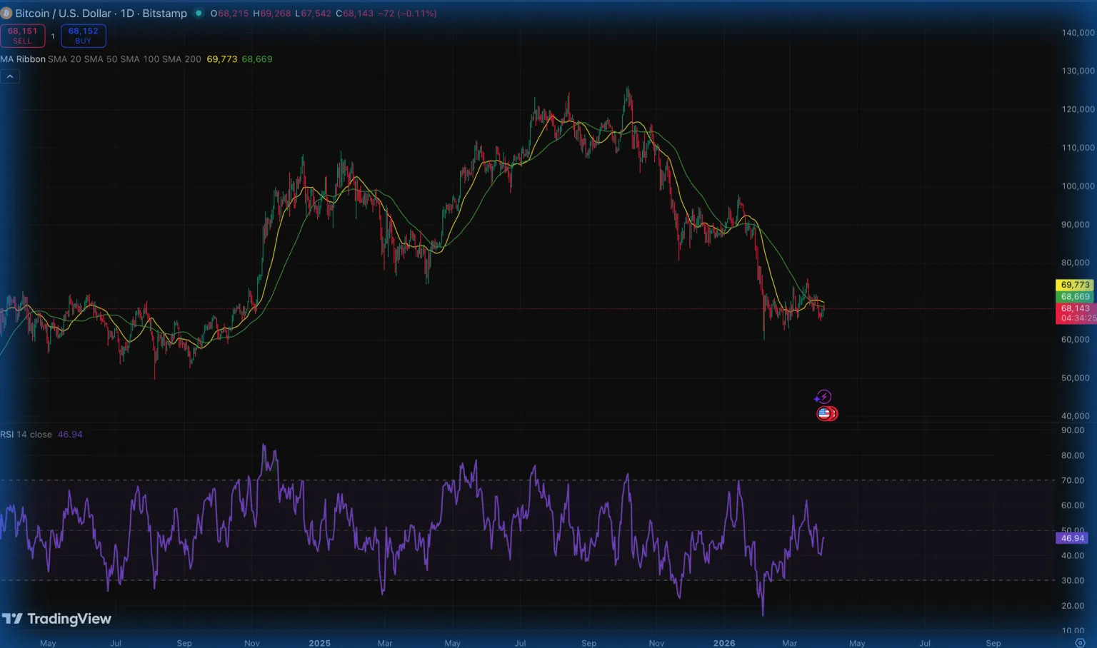 For crypto, we can look at Bitcoin to have an idea of how the market is performing overall. The image below shows that BTC has experienced a significant drop. However, in most recent days, we have a total lack of trends. Prices are moving around the 20-day and 50-day moving averages and the RSI is orbiting the middle ground. This can either be a sign of accumulation for a trend reversal or accumulation for further bearish pressure. The RSI-price movements show convergence, instead of divergence, with both marking lower lows and highs.