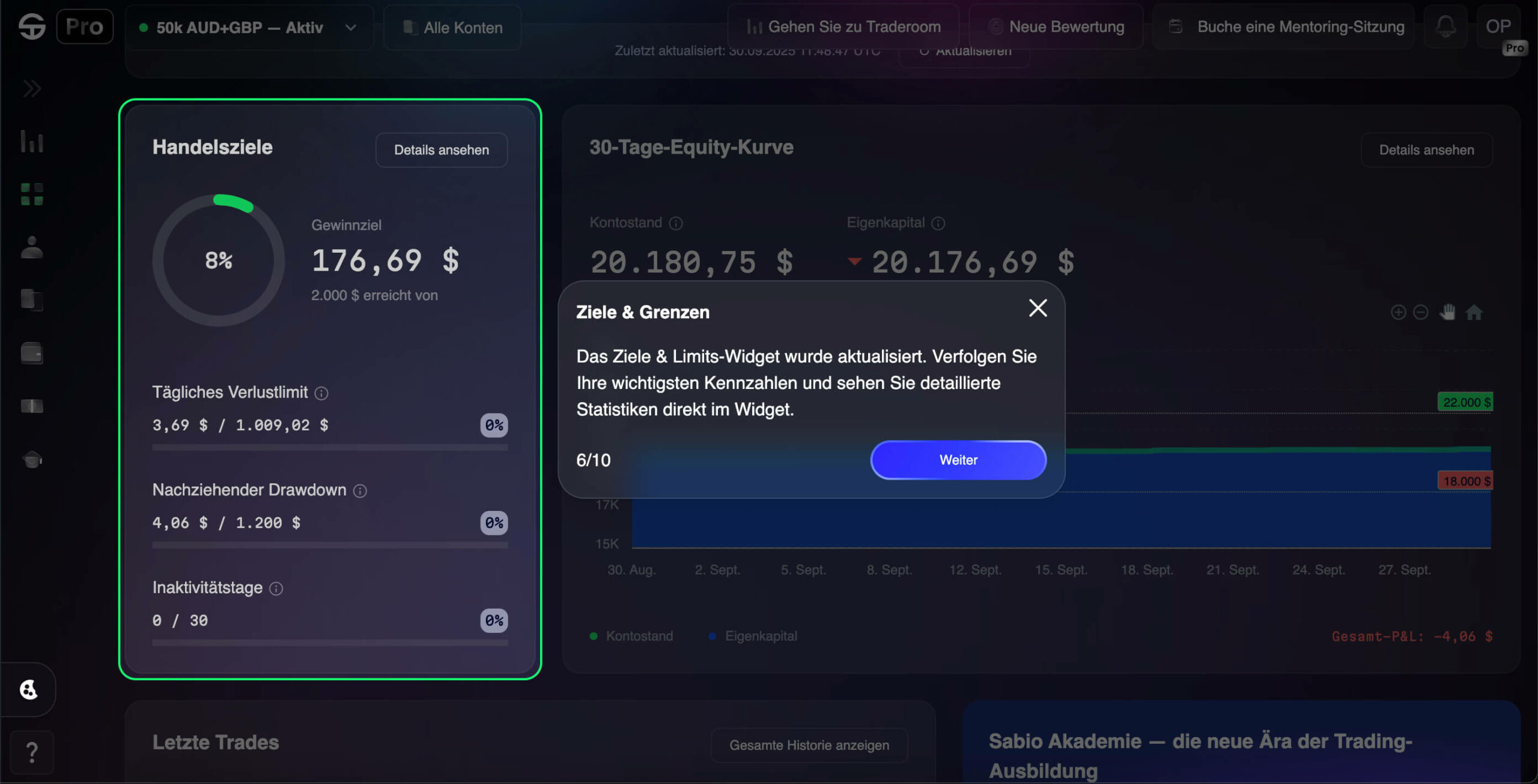Deshalb haben wir das Sabio Trading Dashboard neu gestaltet — damit das Verfolgen deines Tradings so natürlich (und motivierend) wie möglich ist. Wir sind sehr stolz auf das Ergebnis und hoffen, dass es dir viel Freude bereitet!