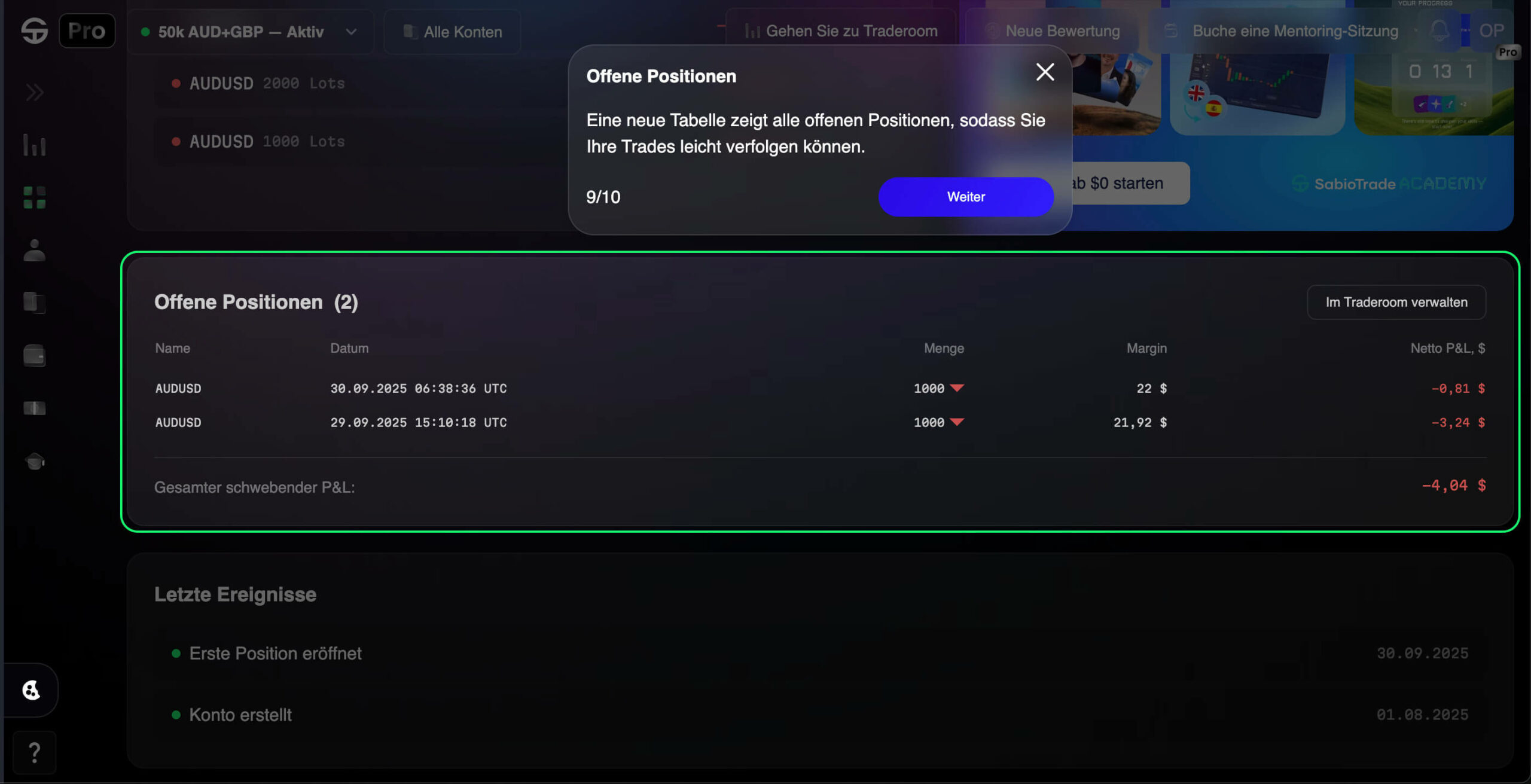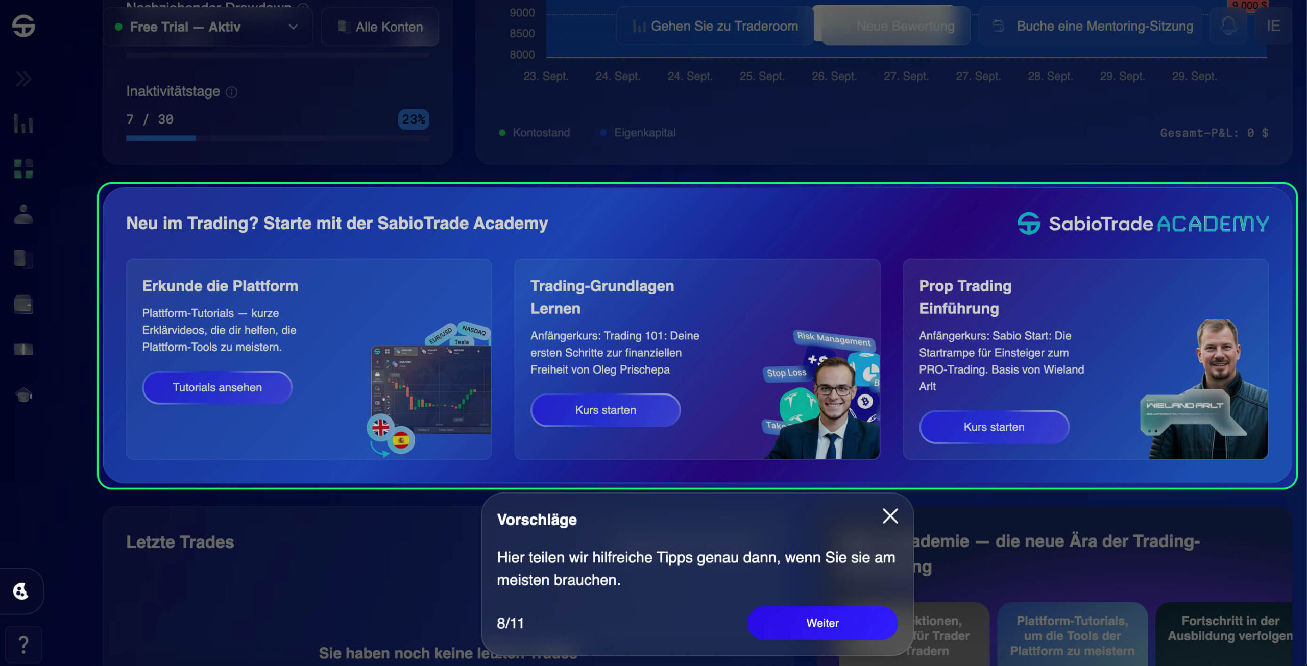 Wusstest du, dass wir eine Sabio Academy haben, in der Trader von den Grundlagen bis zu fortgeschrittenen Strategien lernen. Das Empfehlungs-Widget bringt dieses Wissen direkt in dein Dashboard.