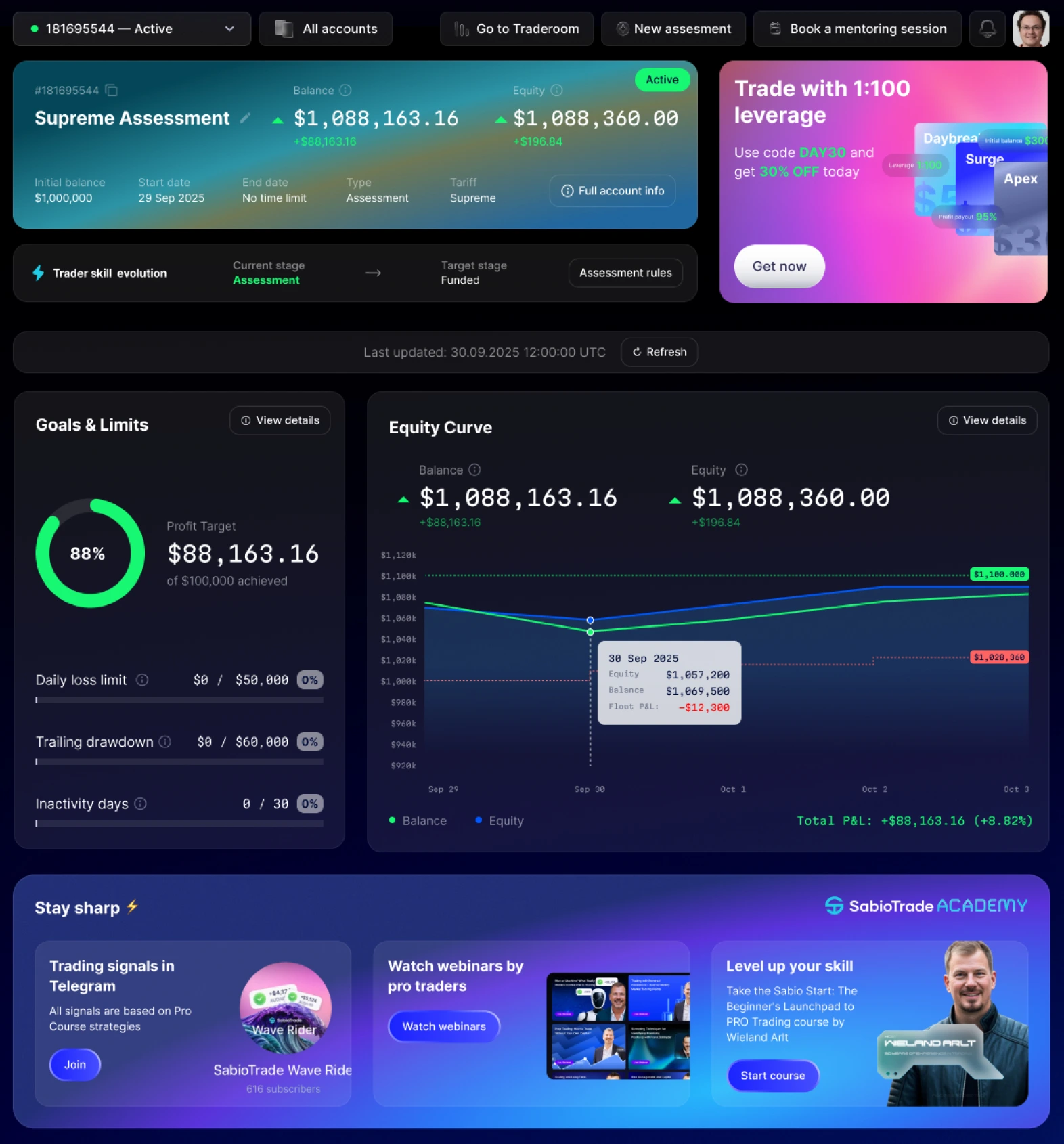 Sabio Trade combine des fonctionnalités qui conviennent à tous les types de traders : une évaluation simple en 1 étape et une éducation gratuite pour les débutants, du mentorat pour les traders en développement, et un financement extra-large pour les professionnels.