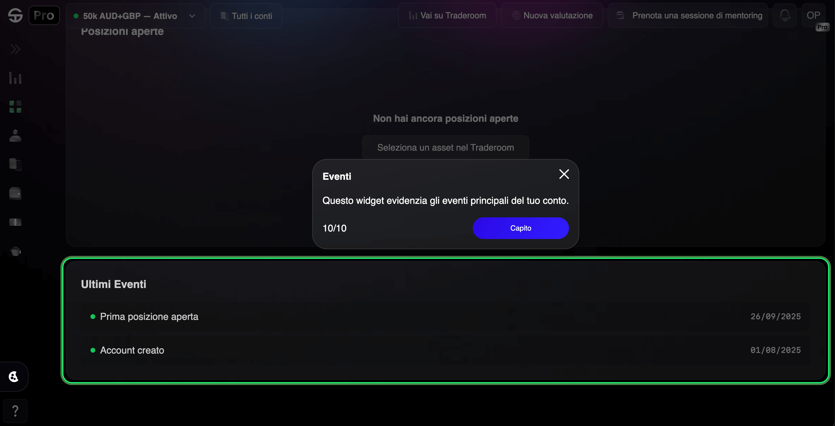 Il Widget Ultimi Eventi funziona come una timeline personale del tuo conto, registrando traguardi chiave come la creazione del conto, la prima operazione e ogni passo importante successivo.
