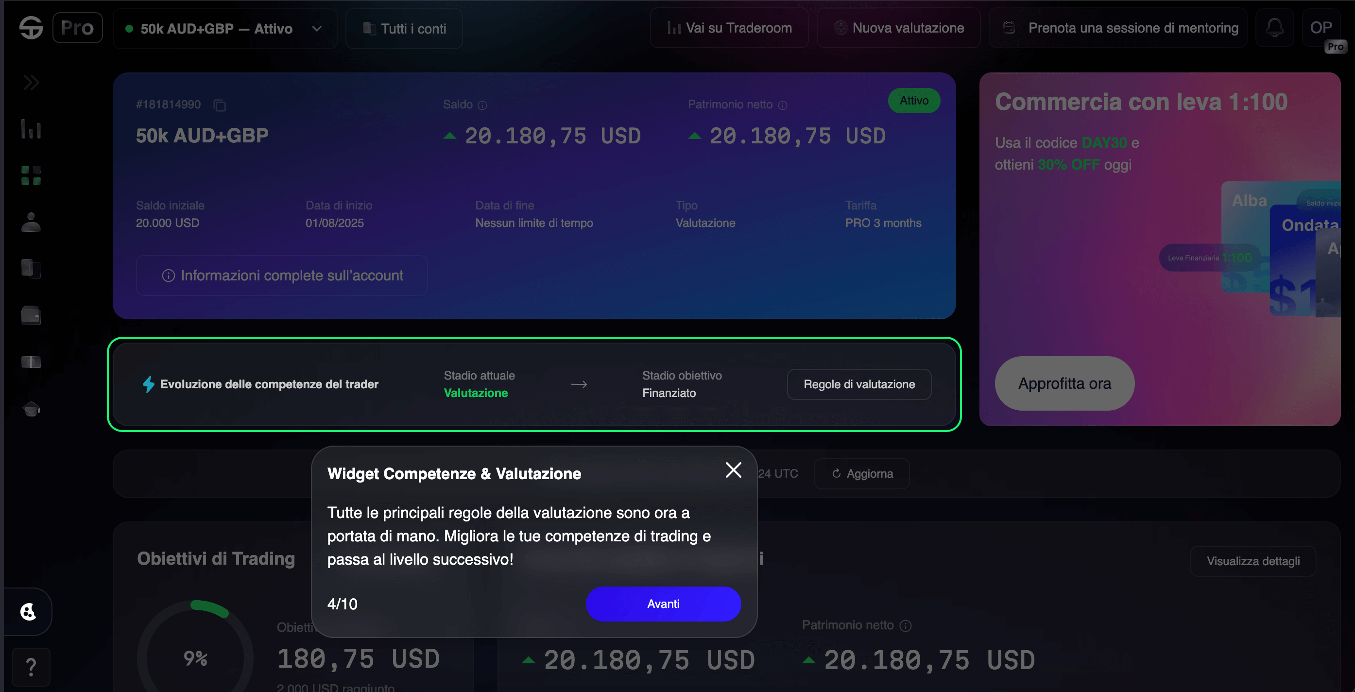 Il Widget di Evoluzione delle Competenze del Trader mostra esattamente dove sei nel tuo percorso di trading e quanto sei vicino a raggiungere il livello successivo.