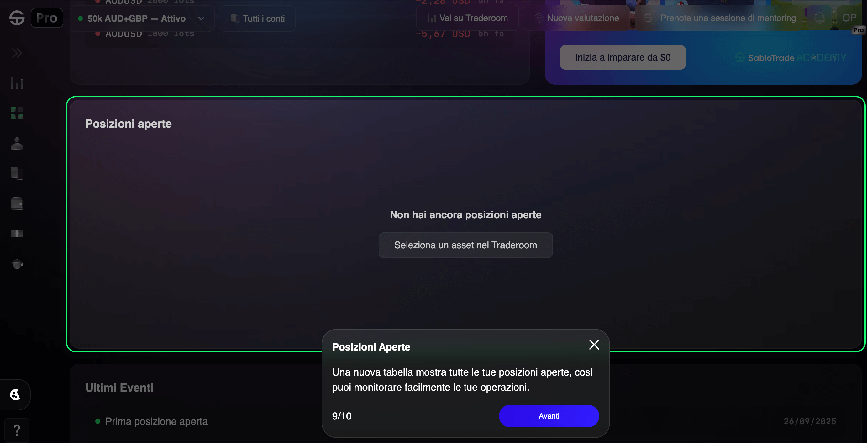 Lo troverai sempre in fondo al tuo dashboard, mantenendo un registro per non perdere mai di vista la tua evoluzione nel trading.