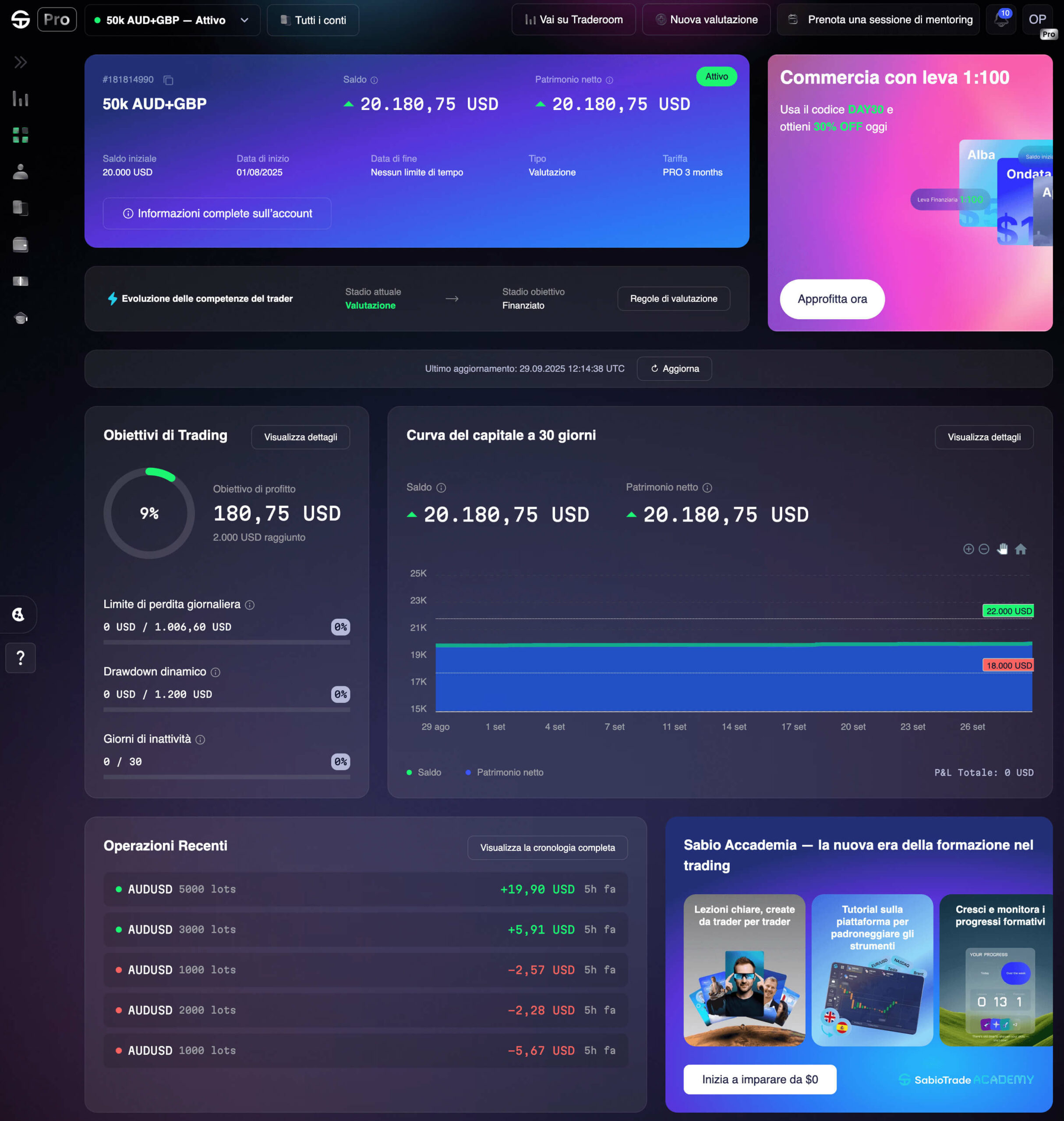 Per questo abbiamo ricostruito il Sabio Trading Dashboard — per rendere il monitoraggio del tuo trading il più naturale (e motivante) possibile. Siamo molto orgogliosi del risultato e speriamo che ti piaccia!
